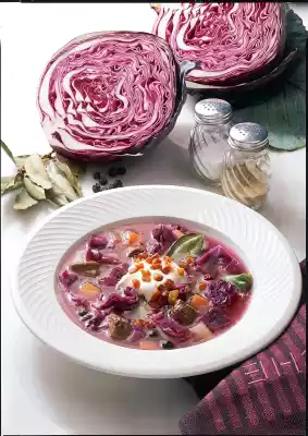 Clean, wash and cut the red cabbage into small pieces and add. Fill up with stock, bring to the boil and add spices. Cook for 1 1/4-1 1/2 hours at medium heat. Remove meat and dice. Add to soup again and season to taste. Serve with crème fraîche and rendered bacon