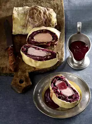 Melt 50 g butter in a saucepan. Roll out the dough very thinly (you must be able to see through the dough) on a large, lightly floured tea towel (at least 45 x 60 cm) to form a rectangle (35 x 50 cm), then pull it over the back of your hand. Spread the dough very thinly with butter. Sprinkle dough with breadcrumbs. Spread the red cabbage mixture on top, leaving a rim of about 2 cm. Place the pork fillet in the middle of the red cabbage. Whip the sides slightly. Roll up from the short side using the tea towel. Place diagonally with the seam side down on a baking tray lined with baking paper. Bake in a preheated oven (electric cooker: 200 °C/ convection oven: 175 °C/ gas: see manufacturer) for approx. 45 minutes. Remove and cut into pieces. Heat up the sauce again and add it to the baking tray