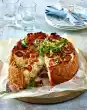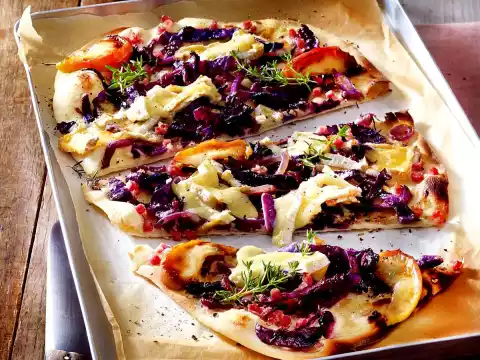 Spread a quarter each of the red cabbage and the onion rings on top. Place 4 apple slices and a few slices of camembert on top. Sprinkle with ham. Bake the tarte flambée in the preheated oven (40;electric range: 225 °C/ convection oven: 200 °C/ gas: see manufacturer) on the middle shelf for about 15 minutes. Tip: Bake two tarte flambée in hot air at once.