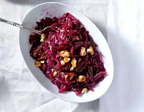 Quarter dates. Add to the cabbage about 10 minutes before the end of cooking time. Remove cinnamon. Stir in jelly. Season red cabbage with salt, a little sugar and vinegar. Sprinkle with nuts to serve.
