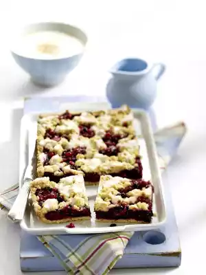 Spread a good 3/4 of the crumbles on a greased baking tray and press down to a base with your hands. Sprinkle the base with breadcrumbs. Spread red fruit jelly on top and sprinkle the remaining crumbles partially over it. Bake in the preheated oven (electric range: 175 °C/ convection oven: 150 °C/ gas: level 2) for approx. 45 minutes on the bottom shelf. Remove from the oven, place on a cake rack and allow to cool. Mix icing sugar and lime juice to a glaze. Brush crumbles with it. Cut into pieces