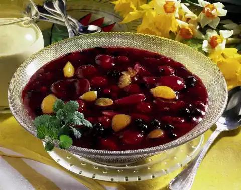 Mix 40 g starch with 5-6 tablespoons of juice. Put the rest of the juice and 50 g sugar in a pot and bring to the boil. Add the starch while stirring. Add berries and fold in. Bring to the boil again briefly. Drain the apricots. Halve the apricot halves and finally fold into the groats.