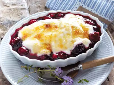 Fold in currants and cherries, simmer for 2-3 minutes while stirring. Remove vanilla pod. Fold in raspberries. Place the groats in six ovenproof dishes and let them cool down.