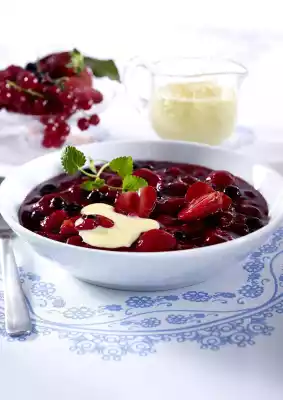 Raspberries selected. Wash the currants and remove from the stalks. Wash the cherries, drain and stone them. Wash, clean and halve the strawberries. Bring 300 ml nectar to the boil in a pot. Stir 50 ml nectar, 25 g sugar, vanillin sugar and starch until smooth. Stir into the boiling nectar, bring to the boil and simmer for about 1 minute while stirring. Add cherries and currants, bring to the boil and simmer for another 1-2 minutes, stirring several times. Remove from the heat, fold in raspberries and strawberries, let everything cool down