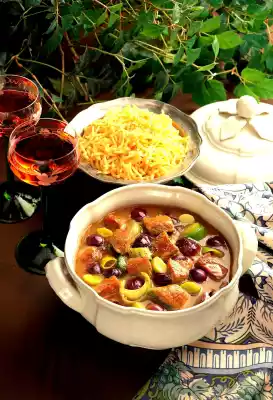 Wash the meat and dab dry. Cut larger pieces in half. Fry the meat in hot lard in portions. Season with salt, pepper and paprika and dust with flour. Sauté well and deglaze with wine and 3/4 litres of water.