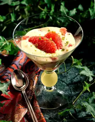 Fold in rum and ground pistachios, up to 1 teaspoon. Fill the zabaglione onto the grapefruit fillets. Pour the rest of the fillets onto the cream. Sprinkle with pistachios