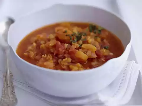 Mash the tomatoes in their own juice with your hands. Add to the vegetables and simmer for about 5 minutes. Chop the apricots finely. Season the tomatoes with 1 teaspoon salt and sugar. Add the stock, bring everything to the boil. Reduce the heat and add the apricots and lentils. Simmer everything for 15-20 minutes. Season the lentil soup with salt and pepper