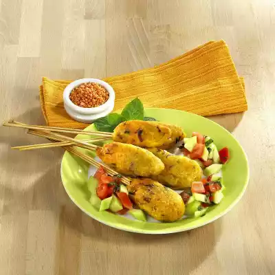 Mix everything with the lentil puree. Stir in egg and flour. Season with cumin, coriander, salt and pepper. Bundle 2-3 wooden skewers each and press 1 tablespoon of the mixture around the upper third. Heat the oil in a pan and fry the kebabs on both sides for about 2 minutes. Place on a baking tray and cook in a preheated oven (electric cooker: 150 °C/ circulating air 125 °C/ gas: level 1) for 10 minutes. Wash the cucumber and tomatoes and dab dry. Peel the cucumber. Quarter cucumber and tomatoes, remove seeds and cut into cubes. Mix vinegar and honey, fold in olive oil. Wash mint, dab dry and chop finely, except for a few stalks for garnishing. Mix mint and sauce with the tomato and cucumber cubes.
