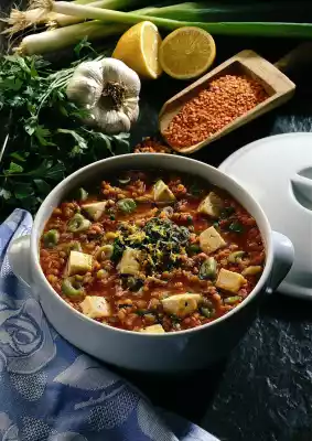 Season with salt and cayenne pepper. Cook for about 15 minutes. Clean and wash spring onions, cut into rings and cook for 10 minutes. Season the stew with salt and pepper. Add the tofu and heat up briefly. Wash the parsley and cut into strips. Mix it with the lemon peel and put it on the lentils