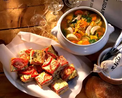 Wash the chicken breast. Cook in 2 litres of boiling salted water for about 25 minutes. In the meantime, clean and wash the leek and peppers. Cut the leek into rings and the paprika into pieces. Peel, wash and slice carrots.