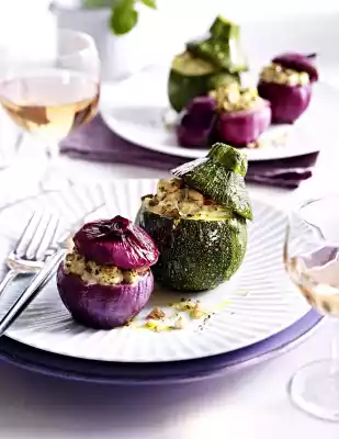 Fill onions and courgettes with the mixture. Place the vegetables in a greased ovenproof dish and sprinkle with the remaining nuts. Place vegetable lid on the bottom of the dish and sprinkle with 3 tbsp. oil. Cook the vegetables in a preheated oven (electric cooker: 200 °C/ convection oven: 175 °C/ gas: see manufacturer) for 20-30 minutes. Remove, place the respective lids on the vegetables and serve