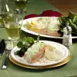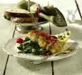 Puree the fish cubes with salt, pepper and remaining lemon juice. Finally add egg white and cream. Spread the farce on the fish fillets and cover with potato slices in flakes. Press on well.