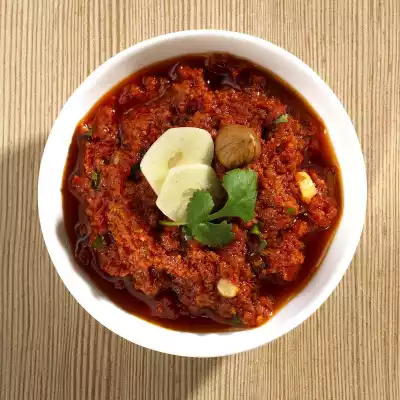 Drain the tomatoes and collect the oil. Cut the tomatoes into cubes. Peel garlic, chop coarsely. Wash coriander, dab dry well, cut leaves into fine strips. Finely puree the tomatoes with garlic, coriander, nuts and sambal oelek.