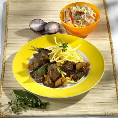 Mix the marinade, onions and tomatoes with the white cabbage. Cook the spaetzle in plenty of boiling salted water for about 12 minutes. Tie the goulash with some sauce thickener. Drain the spaetzle, let it drip off and arrange it on plates with the goulash. Garnish with thyme twigs. Add white cabbage salad