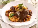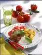 Peel and halve onions and cut into strips. Heat 2 tablespoons of oil in a large pot. Brown the meat all around. Season with salt and pepper. Add onions, celery and carrots and fry for about 3 minutes. Add tomato paste, a few sprigs of thyme and laurel to the pot. Deglaze with porcini mushrooms in the soaking water. Add red wine and braise at medium heat for about 1 hour. In the meantime drain white cabbage in a sieve. Mix sugar, salt, 3 tablespoons of oil and vinegar to a marinade. Wash the tomatoes, dab dry, quarter, seed and cut into strips. Peel and halve red onions and cut them into strips.
