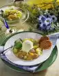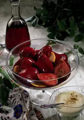 Simmer again for another 3 minutes. Arrange the pears in a bowl, pour the red wine stock over them and let them cool down. Meanwhile, for the cinnamon sabayon, mix the egg yolks with the remaining sugar, lemon juice and white wine. Whisk in a hot water bath for about 10 minutes. Add the cinnamon and stir cold in a cold water bath. Pour into a sauce boat, dust with cinnamon and serve with the pears