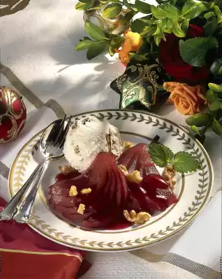 Stir starch and a little water until smooth. Bind wine stock with it and let it cool down. Chop the nuts. Cut the pears in a fan-like fashion. Form ice cream into balls or curls. Serve with pears and sauce. Sprinkle the nuts, decorate