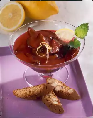 Let the plums cool down a little. Pour into dessert glasses and decorate as desired with lemon and lemon balm. Serve dessert cold. Serve with crispy biscuits with almonds