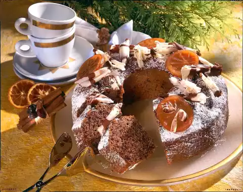 Heat red wine and let the mulled wine spice steep in it. Let the liquid cool down. In the meantime, stir the room-warm fat, sugar, vanillin sugar and salt with the whisk of the hand mixer until foamy. Gradually stir in the eggs. Mix flour, baking powder, cinnamon and cocoa. Stir tablespoons into the foamy mixture. Remove the mulled wine seasoning from the red wine. Gradually stir orange juice and red wine into the dough. Fold in chocolate flakes. Grease a springform pan (26 cm Ø) with a tube bottom insert and sprinkle with breadcrumbs. Pour in the dough and bake in the preheated oven (electric: 175 °C/ gas: level 2) for approx. 60 minutes. Remove the cake from the oven and let it cool down on a cake rack. Remove from the tin. Melt the chocolate coatings separately in a hot water bath. First spread the dark chocolate coating on a marble plate and let it set. Then spread the white couverture thinly and evenly over it. Place in a cool place until the mixture is firm. Use a spatula to form small rolls. Dust the cake with icing sugar. Decorate with chocolate rolls and orange slices