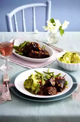 Season to taste with salt and pepper. Put the roulades back into the sauce. Bring the milk briefly to the boil. Drain the potatoes, add the milk and mash into puree. Stir in pesto. Arrange roulades with sauce, beans and mashed potatoes.