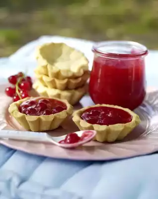 Press in the dough pieces. Prick the cake several times with a fork. Place the ramekins on a baking tray. Bake in the preheated oven (electric cooker: 200 °C/ convection oven: 175 °C/ gas: level 3) for about 15 minutes. Let the shortcrust pastry bases cool down and carefully turn out of the tins. Pour the fruit spread into the short pastry bases on site