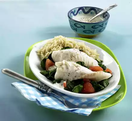 Clean and wash the spinach and let it drain on a sieve. Peel the shallot and cut into fine cubes. Cook rice in boiling salted water according to package instructions. Wash the fish and cut in half lengthwise.