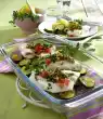 Season to taste with salt, pepper and nutmeg. Arrange vegetables, fish, rice and sauce on a plate. Sprinkle with coloured pepper.