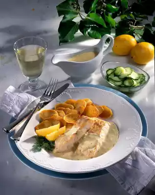 Bring to the boil and season to taste with mustard, salt and pepper. Remove the pot from the heat. Add egg yolk and stir in. Do not boil any more. Whip cream lightly and stir into the sauce. Arrange fish, fried potatoes and sauce on plates and serve garnished with lemon wedges and dill as desired. Cucumber salad tastes good with it