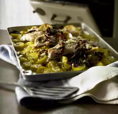 Cut the dried tomatoes into fine strips. Wash the fish fillets and dab them dry. Sprinkle with lemon juice and olive oil and salt. Cut potatoes into slices and place them on a tray or in a large dish.
