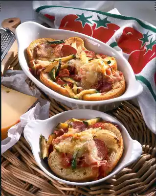 Put the slices of bread in 4 small gratin dishes. Add the spiced tomato sauce. Spread zucchini, onions and cabanosini slices on top. Drizzle with remaining oil. Grate cheese finely and sprinkle over it.