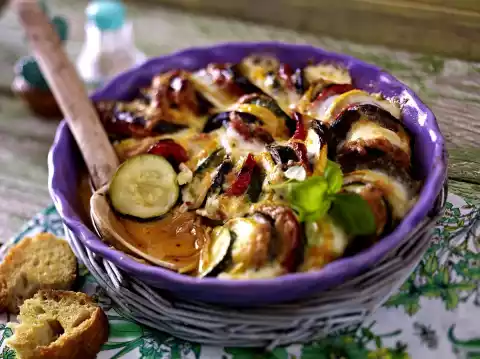Preheat oven (electric cooker: 200 °C/circulating air: 180 °C/gas: see manufacturer). Wash the tomatoes. Clean and wash the zucchini and eggplant. Cut the vegetables into 2-3 mm thin slices, then alternately layer them in the mould, close together like roof tiles.