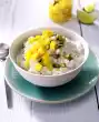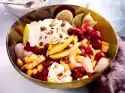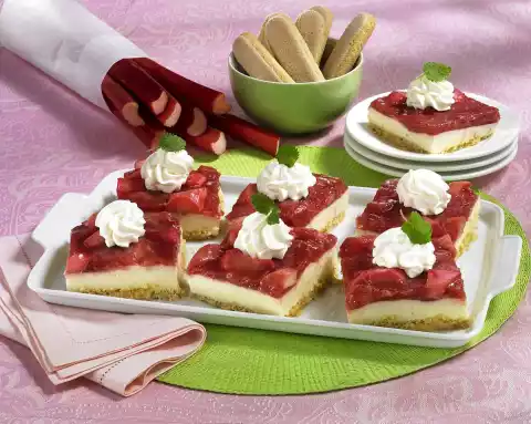 Stir 2 sachets of custard powder, 80 g sugar and 120 ml milk until smooth. Bring 880 ml milk to the boil and stir in the mixed powder. Simmer the pudding for about 1 minute, then pour into a bowl. Cover the surface of the pudding with foil and chill. Clean and wash the rhubarb and cut it into pieces about 1.5 cm wide. Stir 2 sachets of pudding powder and 100 ml juice until smooth.