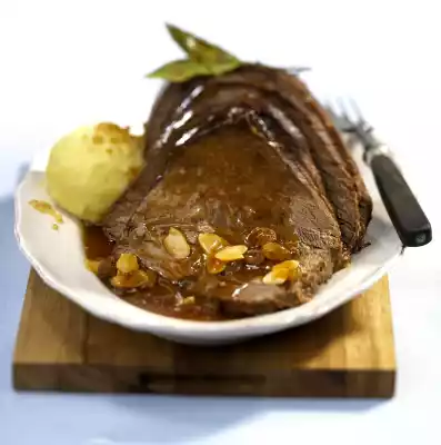 Put the roaster on the stove and remove the meat. Stir cornflour and three tablespoons of water until smooth and thicken the stock. Bring to the boil again and season to taste with salt, pepper and sugar. Cut the roast into slices and serve with the sauce. Garnish with bay leaf. Serve with potato dumplings