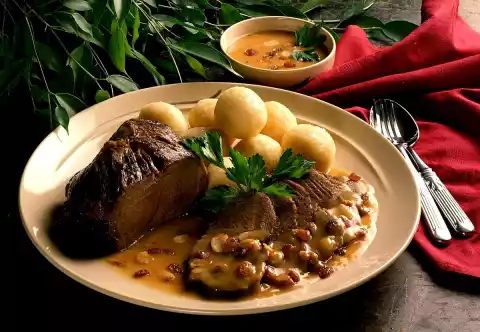 Season to taste with salt and pepper. Arrange meat, dumplings and some sauce on a plate. Garnish with parsley. The rest of the sauce is extra.