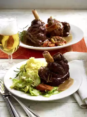 Put the knuckles on the vegetables. Pour in juice and wine and bring to the boil. Cover and braise in the preheated oven (electric cooker: 175 °C/circulating air: 150 °C/gas: level 2) for about 1 hour. Then open and roast for another 50-60 minutes.