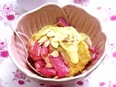 Line the bottom of a greased pudding mould (approx. 900 ml capacity) with the rhubarb, sprinkle with syrup. Put the sponge mixture on top, smooth it down. Place 2 pieces of foil on the mould. Fold the protruding edges onto the mould. Remove the foil, cut a hole in the middle and grease the underside of the foil. Put the foil back on and tie it tightly over the mould with kitchen yarn