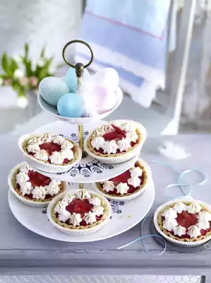 water until smooth, add to the compote and simmer while stirring for about 1 minute. Let cool down a little. Spread the compote evenly in the moulds and let it cool down. Beat the egg whites until stiff (6-8 minutes), add 100 g sugar. Pour meringue mixture into a piping bag with a small star-shaped spout. Spray small tuffs as a wreath on the edge of the tartlets. Bake in the preheated oven (electric cooker: 225 °C/ convection oven: 200 °C/ gas: level 4) for about 4 minutes. Take out and let cool down