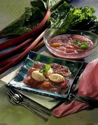 Steam the rhubarb for about 10 minutes. Stir cornstarch in 4 tablespoons of water until smooth, thicken compote with it. Stir in the apricots and let it cool down. In the meantime boil up the milk. Add remaining sugar, vanilla sugar and fat.