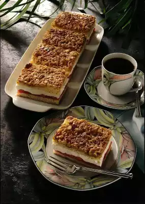 Spread vanilla cream evenly on the rhubarb layer. Cut the upper bee sting strips into 6 approx. 5 cm wide pieces each. Remove the aluminium foil from the filled strips and also cut the strips into 6 approx. 5 cm wide pieces.