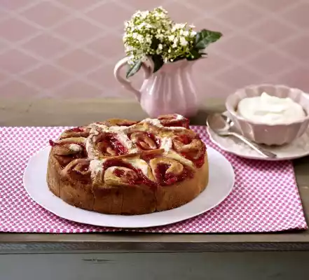 Briefly knead the yeast dough again and roll out into a rectangle (approx. 28 x 38 cm) on a lightly floured tea towel. Spread with the rhubarb-strawberry compote. Leave a 2-3 cm wide strip on the long sides and a 1 cm wide strip on the short sides. Roll up the dough from one long side using the cloth. Cut the roll into approx. 10 thick slices. Place the cut surfaces facing down in a greased springform pan (approx. 26 cm Ø) sprinkled with breadcrumbs. Cover and leave to rise for about 15 minutes.