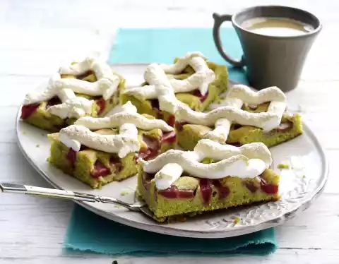 Put the sponge mixture into the greased fat pan of the oven (32 x 39 cm) and smooth it down. Spread rhubarb evenly on top. Beat 3 egg whites until stiff, add 150 g sugar. Beat the meringue until the sugar has dissolved. Pour the mixture into a piping bag and spray onto the cake in a grid pattern. Bake in the preheated oven (electric cooker: 200 °C/ convection oven: 175 °C/ gas: level 3) for 25-35 minutes. Remove from the oven, place on a cake rack and allow to cool