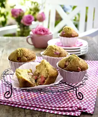 Line the troughs of a muffin tin (12 troughs) with baking cups. Clean and wash the rhubarb, halve it lengthwise and cut it into small pieces. Mix flour, baking powder, cinnamon and sugar in a bowl. Whisk egg, milk, yoghurt and oil. Add the flour mixture, mix briefly. Fold in rhubarb
