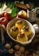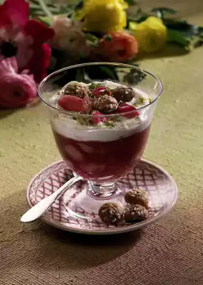Take some pieces of rhubarb out of the brew for decoration. Mix starch and amaretto until smooth, stir into the rhubarb and bring to the boil again. Remove the cinnamon stick, fill the compote into 4 dessert glasses and let it set.