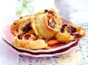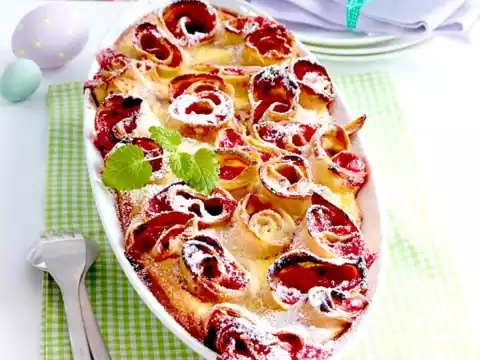 Whisk cream, sugar and 4 eggs. Spread about 2 tbsp. compote on each crepe, roll up. Cut each crepe into 3-4 pieces. Place them in a flat casserole dish with the cut edge facing downwards and pour the egg cream over them. Bake in a preheated oven (electric cooker: 200 °C/ convection oven: 175 °C/ gas: see manufacturer) for approx. 35-45 minutes until the egg cream has set. Cover with foil after about 15 minutes. Remove from the oven, dust with icing sugar and garnish with lemon balm