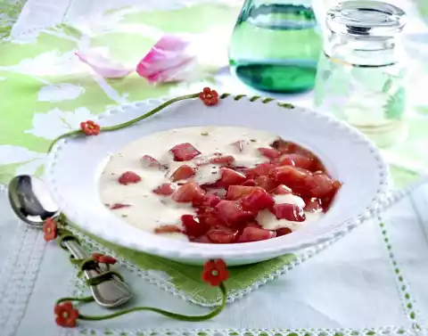 Wash and clean the rhubarb and, depending on the strength, cut the stems in half lengthwise. Cut the stems into pieces of about 1 cm length. Boil up the apple juice to 4 tbsp. Stir pudding powder and remaining juice until smooth. Bind the juice with it and bring to the boil again. Sweeten with 100 g sugar. Add the rhubarb to the bound juice, bring to the boil, simmer for about 5 minutes and chill