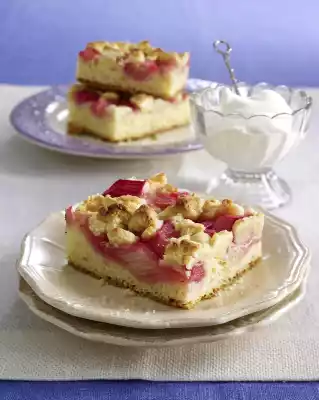 Knead yeast dough with floured hands once more. Grease a fat pan (32 x 39 cm) and dust with flour. Roll out dough to the size of the baking tray, line baking tray with it. Press the edges firmly with your hands and let it rise again in a warm place for about 30 minutes. Spread rhubarb compote on the yeast dough and sprinkle with crumbles. Bake in the preheated oven (electric range: 175 °C/ convection oven: 150 °C/ gas: level 2) for 35-40 minutes. Leave to cool for about 1 hour. Whipped cream tastes good with it