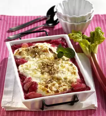 Place the rhubarb in 2 small (750 ml capacity each) or 1 large (1.5 litre capacity) casserole dish. Stir 75 ml maple syrup into the rice pudding. Separate the egg. Beat egg white and salt until stiff, whisk egg yolk and cream, stir into the rice pudding.