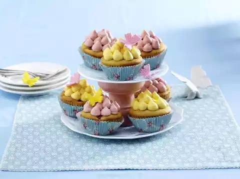 Place cooled muffins in colored paper cuffs. Put the creams in a piping bag with a perforated nozzle (13-14 mm Ø) and spray a small pyramid of dots onto the muffins. Put the muffins in a cool place for about 1 hour. Sprinkle them with sugar pearls and decorate with butterflies