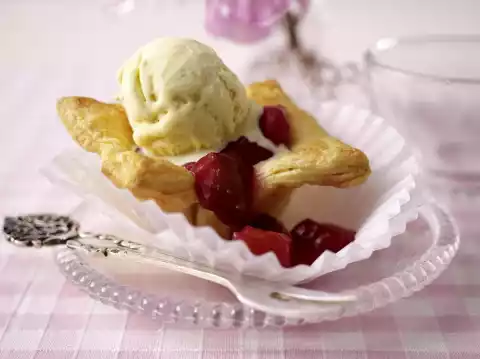 Stir red fruit jelly powder with 4 tablespoons of apple juice and sugar until smooth. Add the mixed powder to the boiling apple juice and bring to the boil once. Add the rhubarb pieces and simmer for about 5 minutes and let it cool down. Remove the puff pastry shells from the oven, let them cool down for about 5 minutes and lift them out of the moulds. Spread the cold compote on the puff pastry shells and place a scoop of vanilla ice cream on each