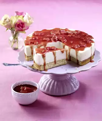 Remove the cake ring, arrange the cake on a plate. Before serving, spread the rhubarb compote on the cake and cut into pieces